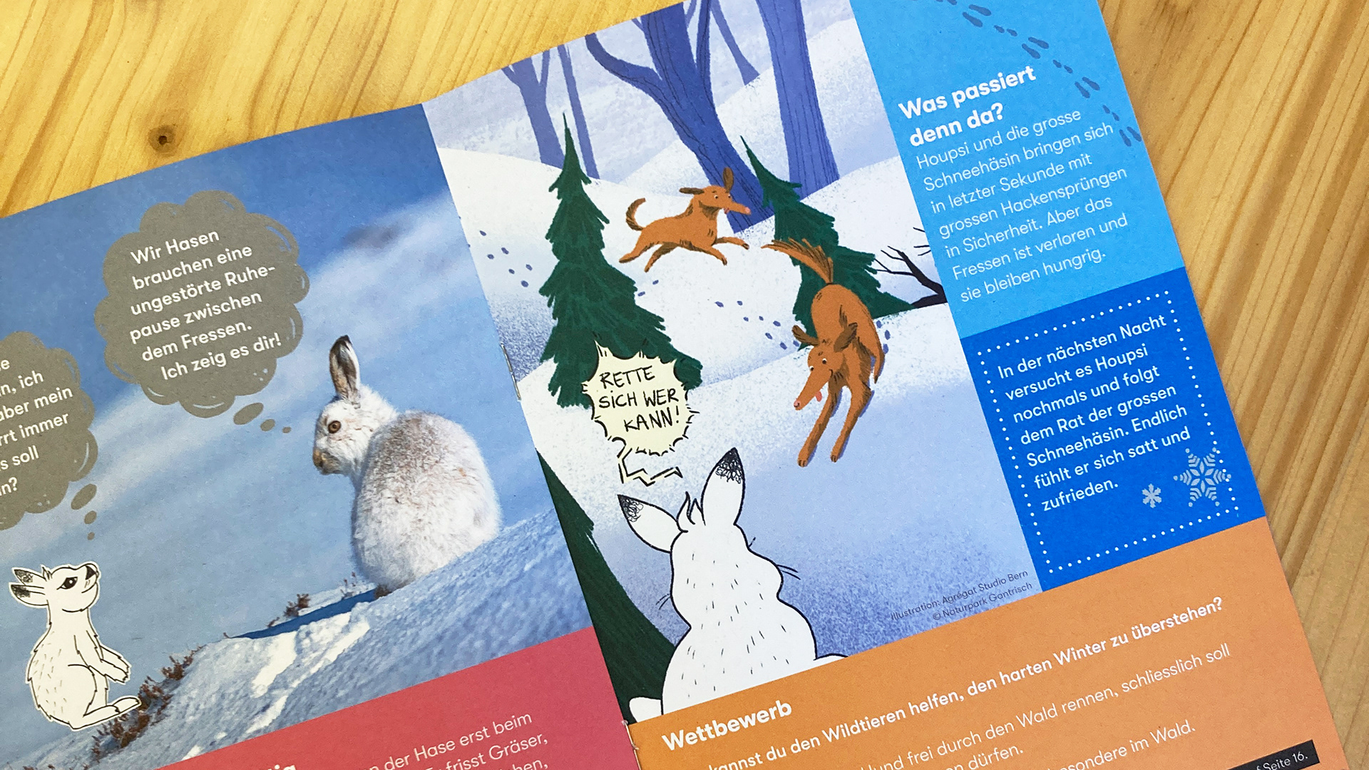 Für das Kindermagazin "Gantrisch Entdecker" vom Naturpark Gantrisch konnte Sarah drei Illustrationen zur Wintersensibilisierung umsetzen: Die Kinder sollen sich bewusst werden, dass der Wald und die Berge das zuhause von Wildtieren sind und wir mit respektvollem Verhalten Störungen verringern können. Houpsi, der kleine Schneehase, erlebt seinen ersten Winter und wird immer wieder aufgeschreckt und vertrieben.